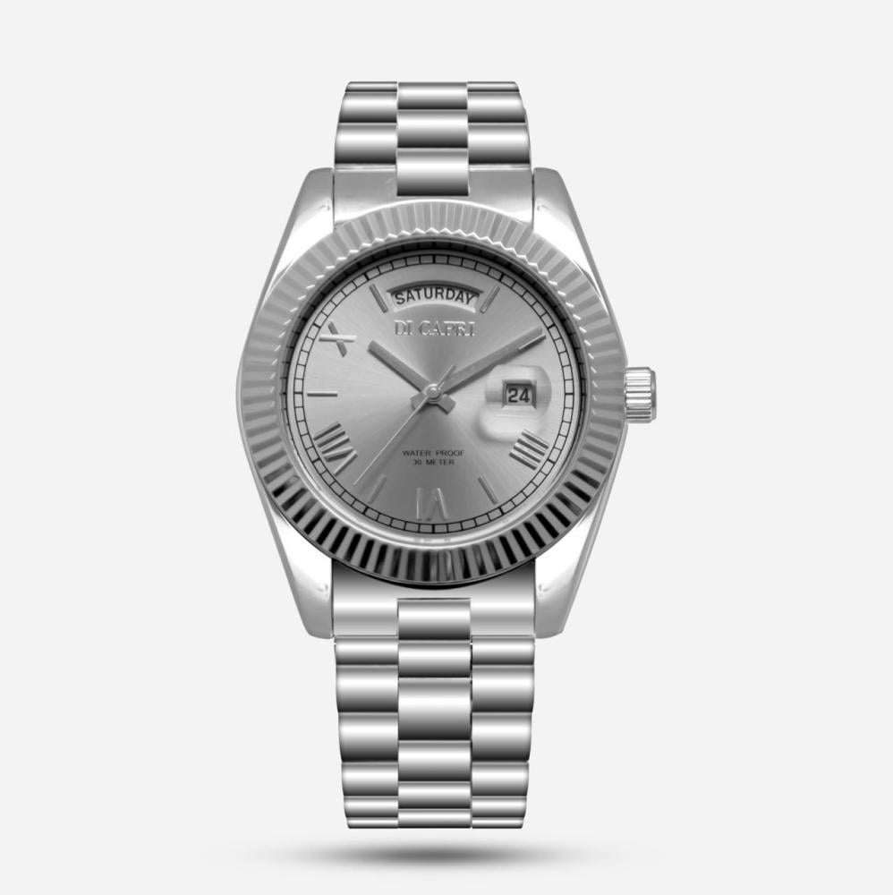 ساعة رجالية أنيقة بميناء رمادي، مقاومة للماء، مصنوعة من الستانلس ستيل. تأتي بتغليف فاخر وخيارات دفع ميسرة عبر تابي وتمارا.